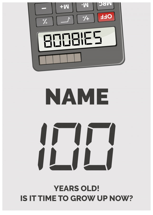 This fun 100th birthday card for an adult has been designed with an upside down calculator with the numbers 5318008 which spells out BOOBIES.