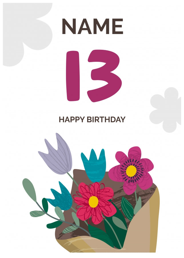 This fun 13th birthday card for her has been designed with a bunch of flowers on the front.