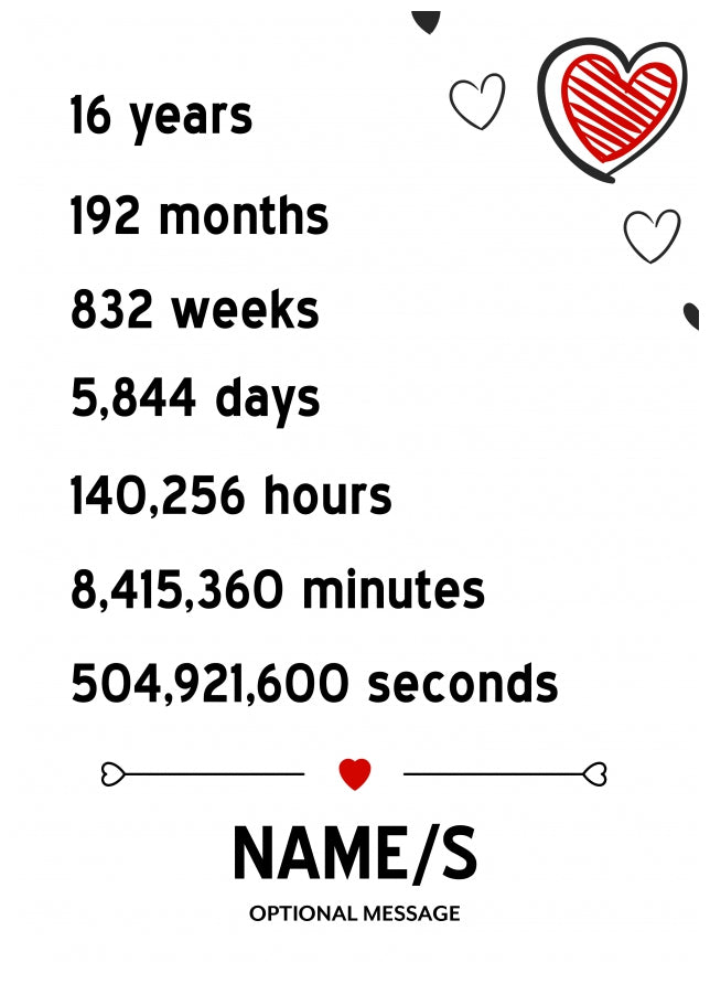 This 16th anniversary Card has been designed with black and red hearts with the following text.