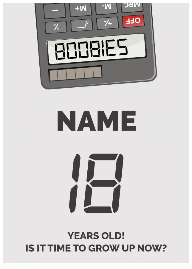 This fun 18th birthday card for an adult has been designed with an upside down calculator with the numbers 5318008 which spells out BOOBIES.