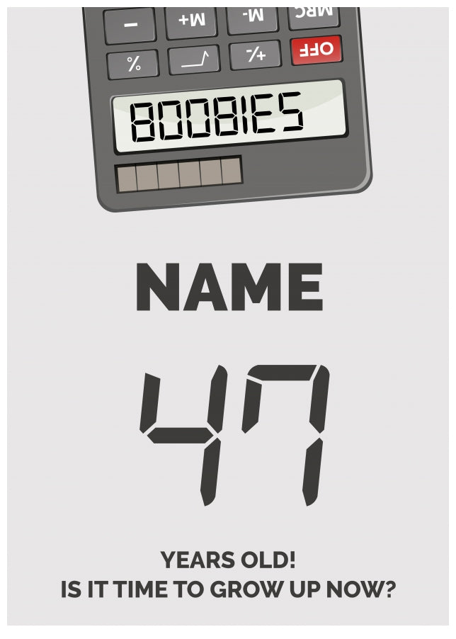 This fun 47th birthday card for an adult has been designed with an upside down calculator with the numbers 5318008 which spells out BOOBIES.