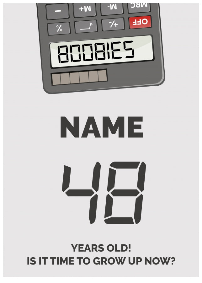 This fun 48th birthday card for an adult has been designed with an upside down calculator with the numbers 5318008 which spells out BOOBIES.