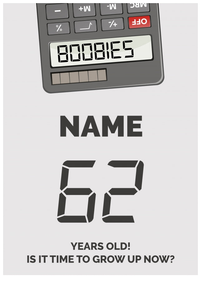 This fun 62nd birthday card for an adult has been designed with an upside down calculator with the numbers 5318008 which spells out BOOBIES.