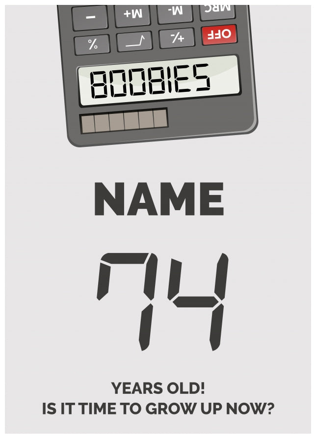 This fun 74th birthday card for an adult has been designed with an upside down calculator with the numbers 5318008 which spells out BOOBIES.