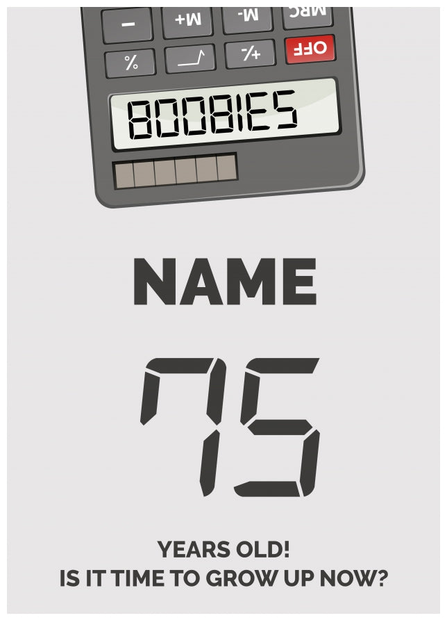 This fun 75th birthday card for an adult has been designed with an upside down calculator with the numbers 5318008 which spells out BOOBIES.