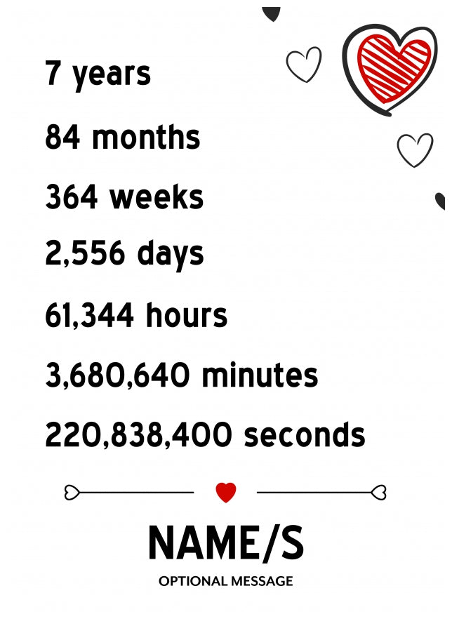 This 7th anniversary Card has been designed with black and red hearts with the following text.