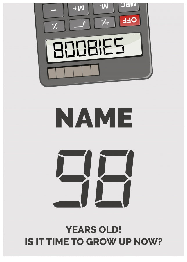 This fun 98th birthday card for an adult has been designed with an upside down calculator with the numbers 5318008 which spells out BOOBIES.