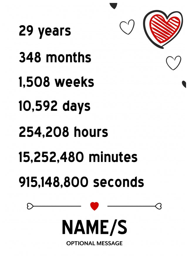 This 29th anniversary Card has been designed with black and red hearts with the following text.
