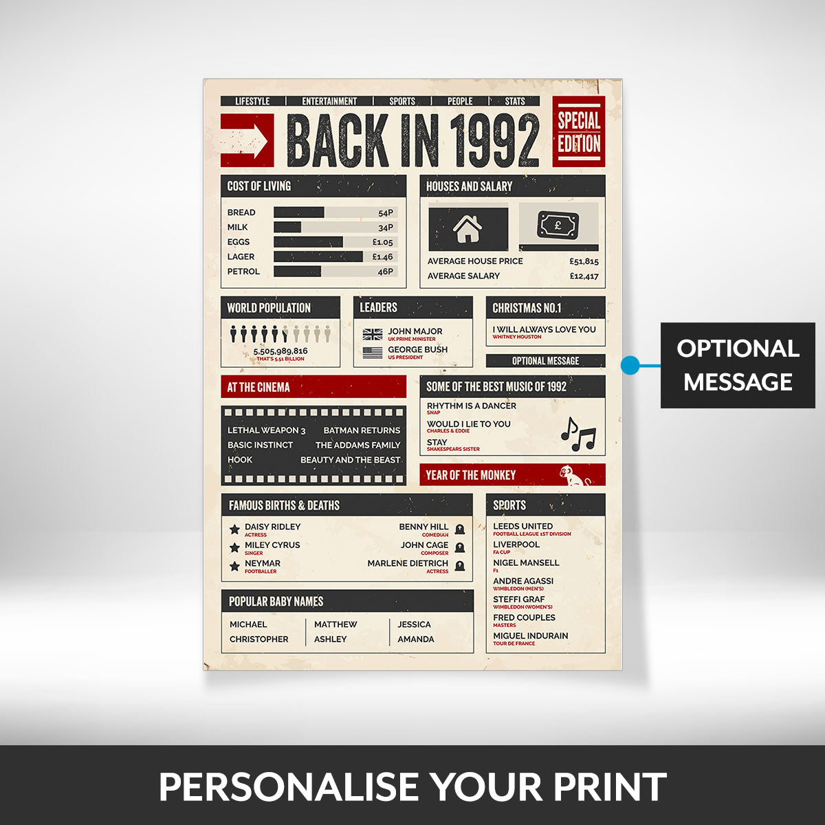 This vintage-inspired design stands out, inviting both men and women to reminisce about the year they were born, 1992. Decorate your home with this unique art print, which acts as a stunning centrepiece and conversation starter.