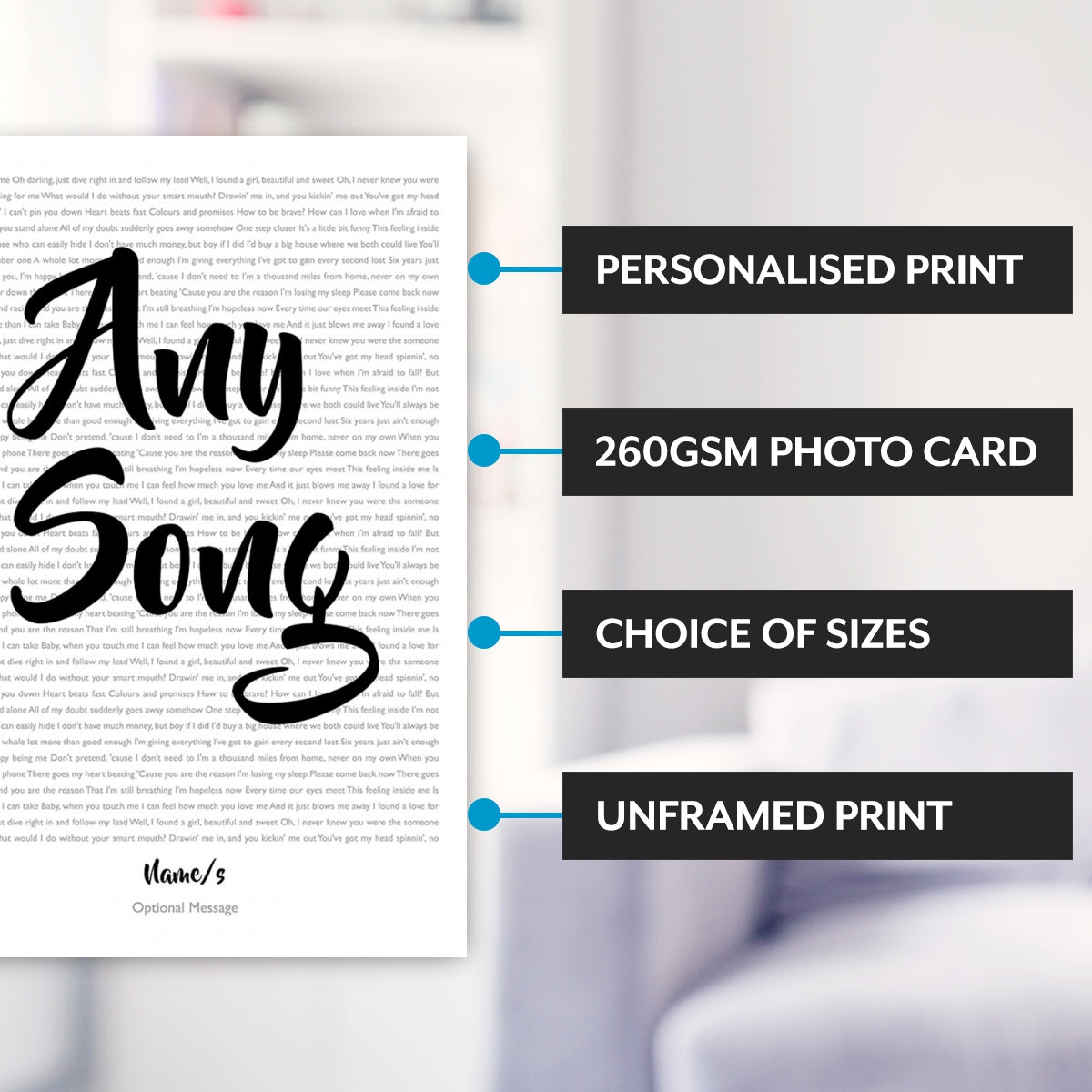 Just let us know the name/s to go on the bottom along with the artist and track name. You can even send us the date of the occasions / short message to add to the bottom however this is optional.