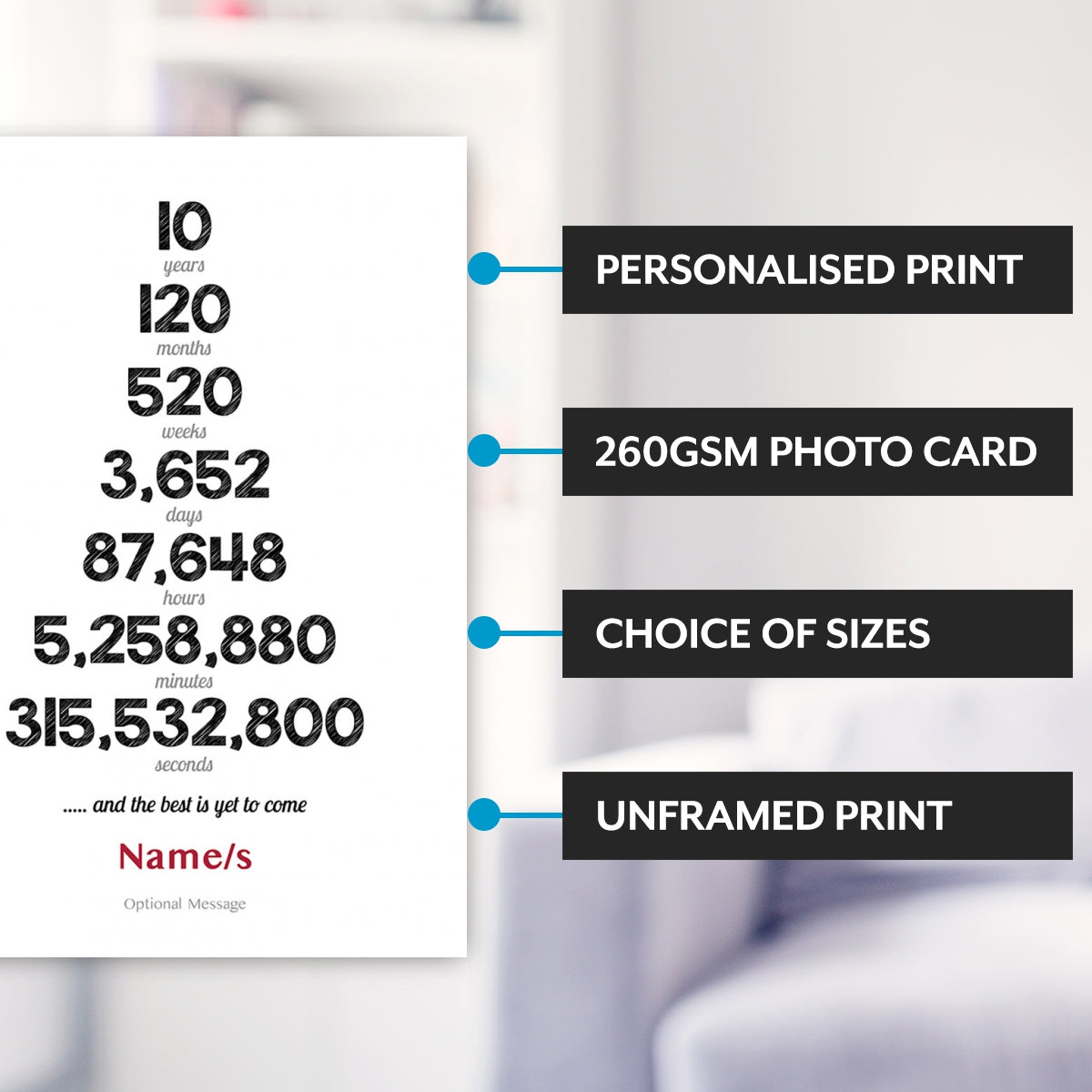 Main features of this 10th wedding anniversary wall art print