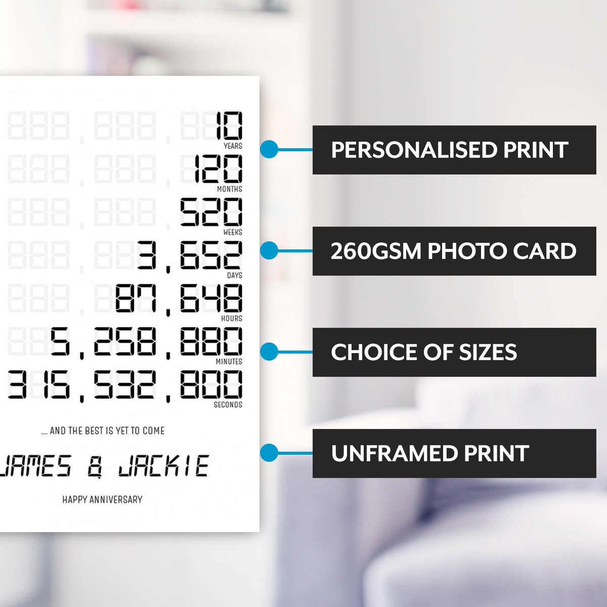 It can be changed to suit any anniversary, all you need to do is let us know the number of years. The print will be produced in full colour, with branded inks and on luxury photo paper for a high quality finish.