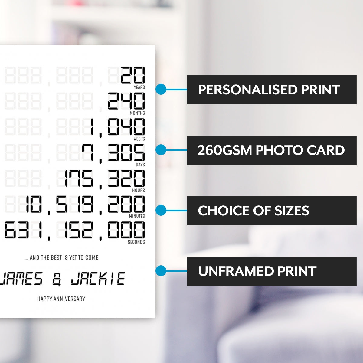 If you're looking for a unique wedding anniversary gift then this could be what you need. This stunning personalised print shows the length of time in number from years to seconds.