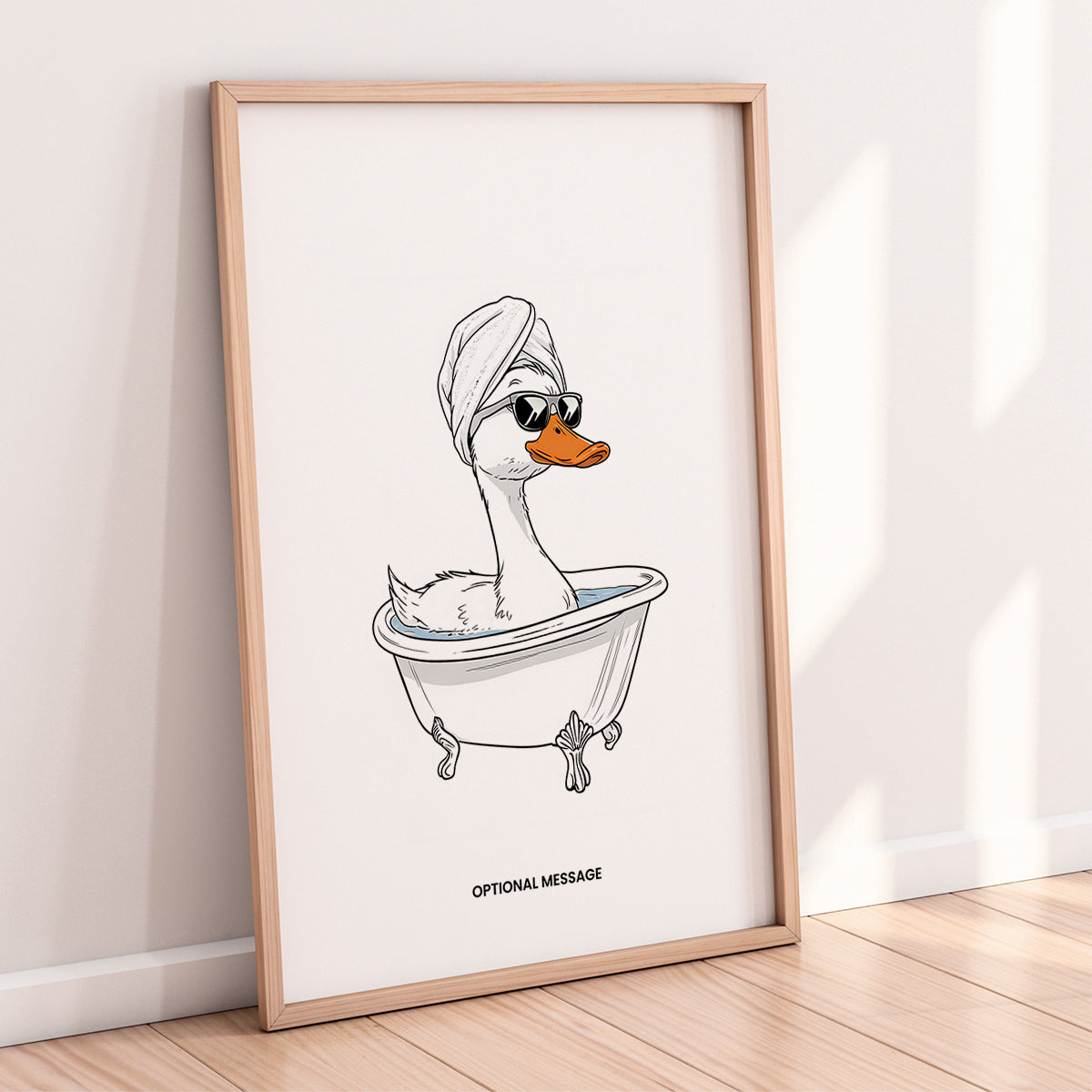 A playful bathroom wall art print featuring a cool duck relaxing in a bath, complete with towel and sunglasses.
