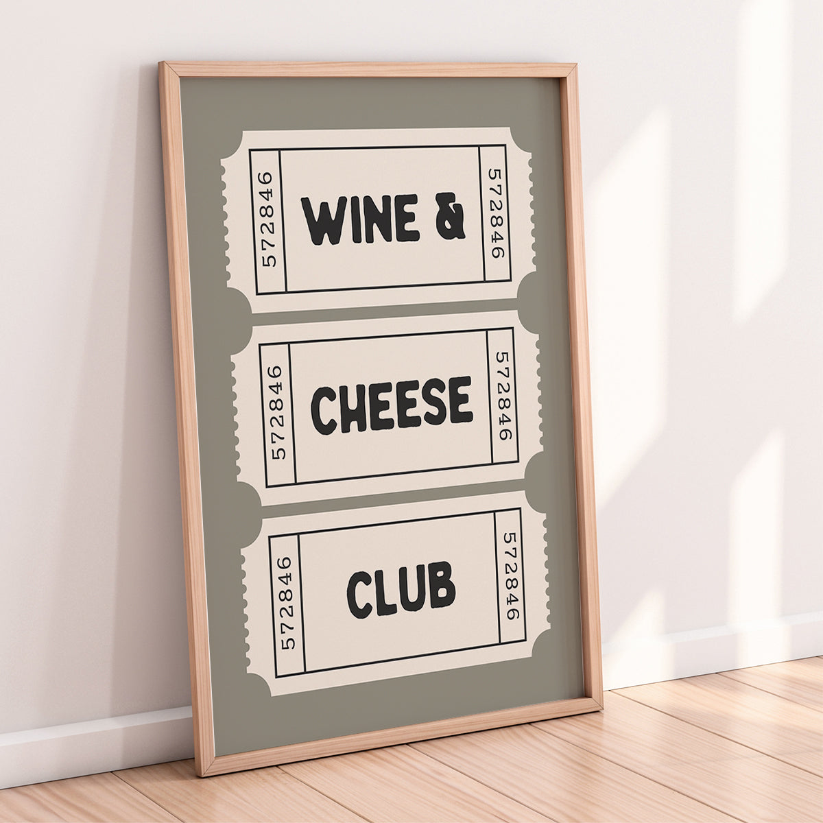 A charming retro style ticket stub print featuring the phrase “Wine and Cheese Club”. Perfect for kitchens, dining rooms, entertaining spaces or anywhere that hosts cosy nights in. The bold, nostalgic ticket design adds personality and warmth to your home decor.