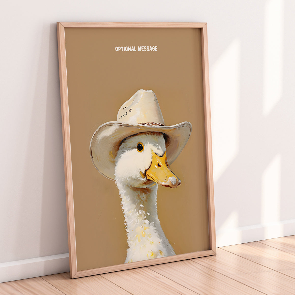 This playful wall art print features a confident duck wearing a cowboy hat, blending rustic charm with light-hearted humour.