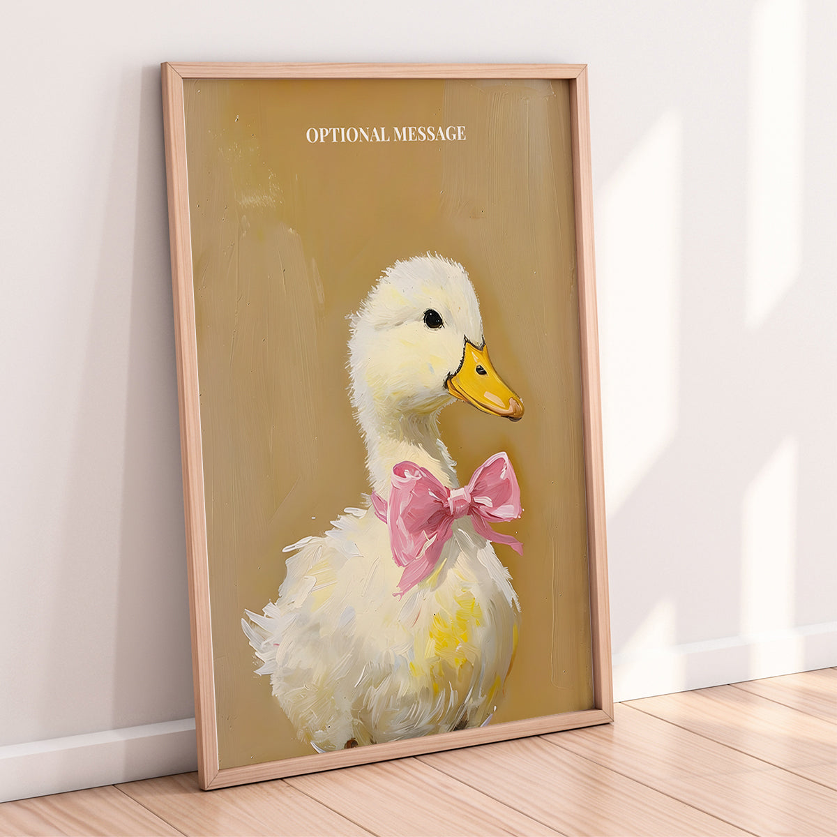 This elegant wall art print features a charming duck adorned with a soft pink bow, illustrated in a gentle vintage-inspired style.