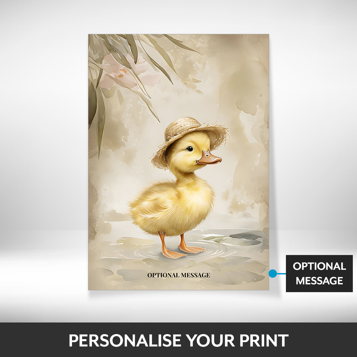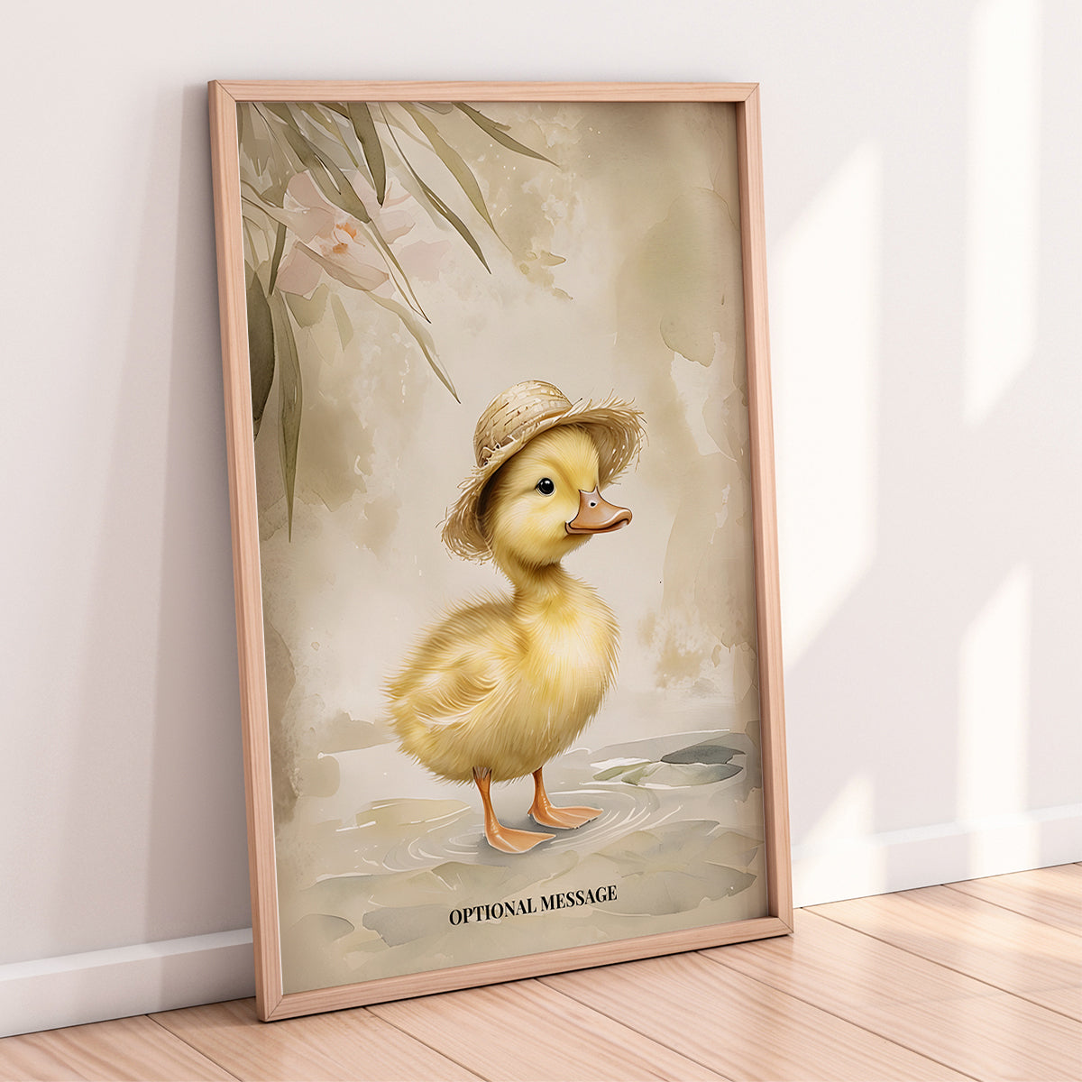 This charming wall art print features a sweet duckling wearing a straw hat, illustrated in a soft vintage-inspired style.