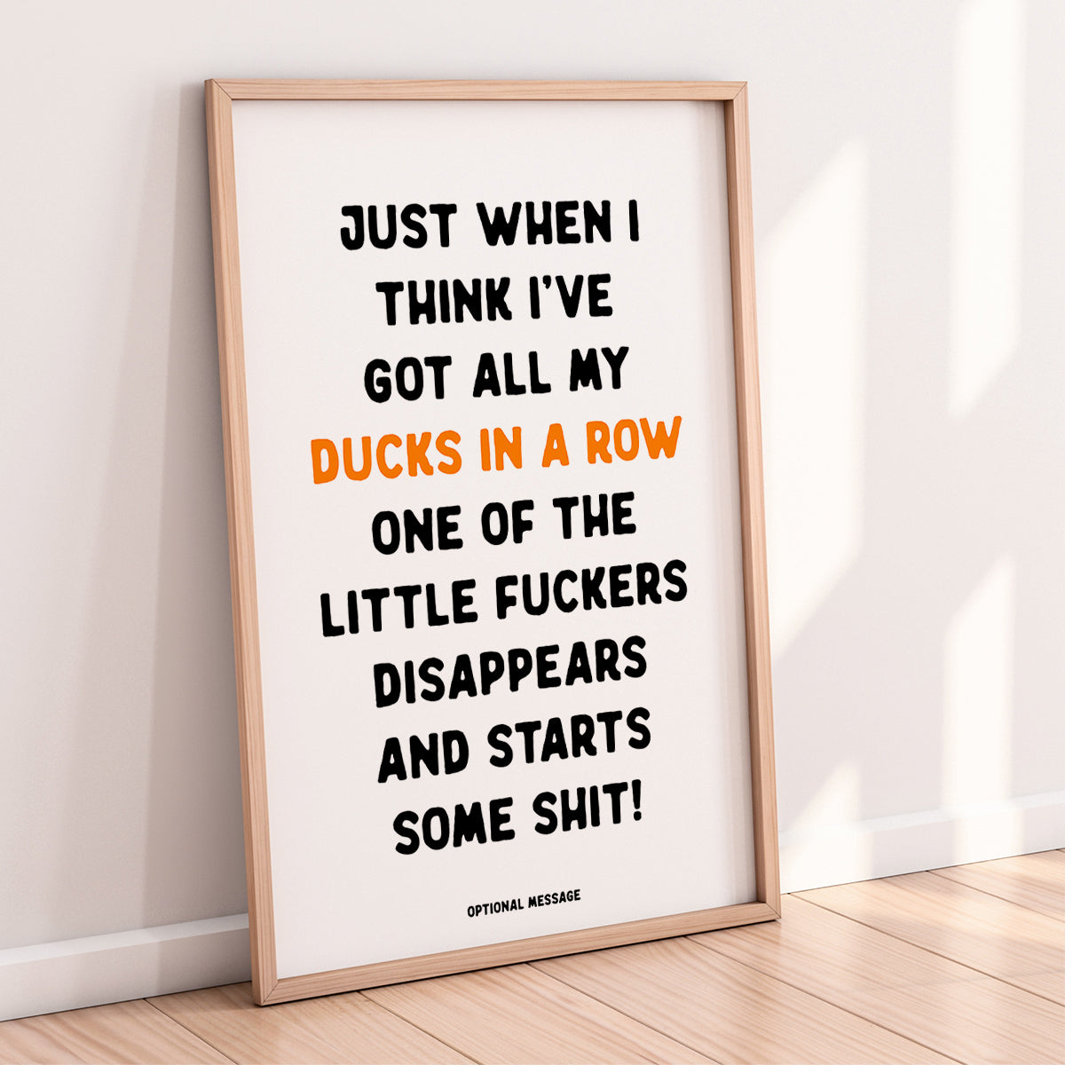 Featuring a swear-filled quote about life, chaos and missing ducks, this print delivers instant attitude with a clean typographic design that stands out in any room.