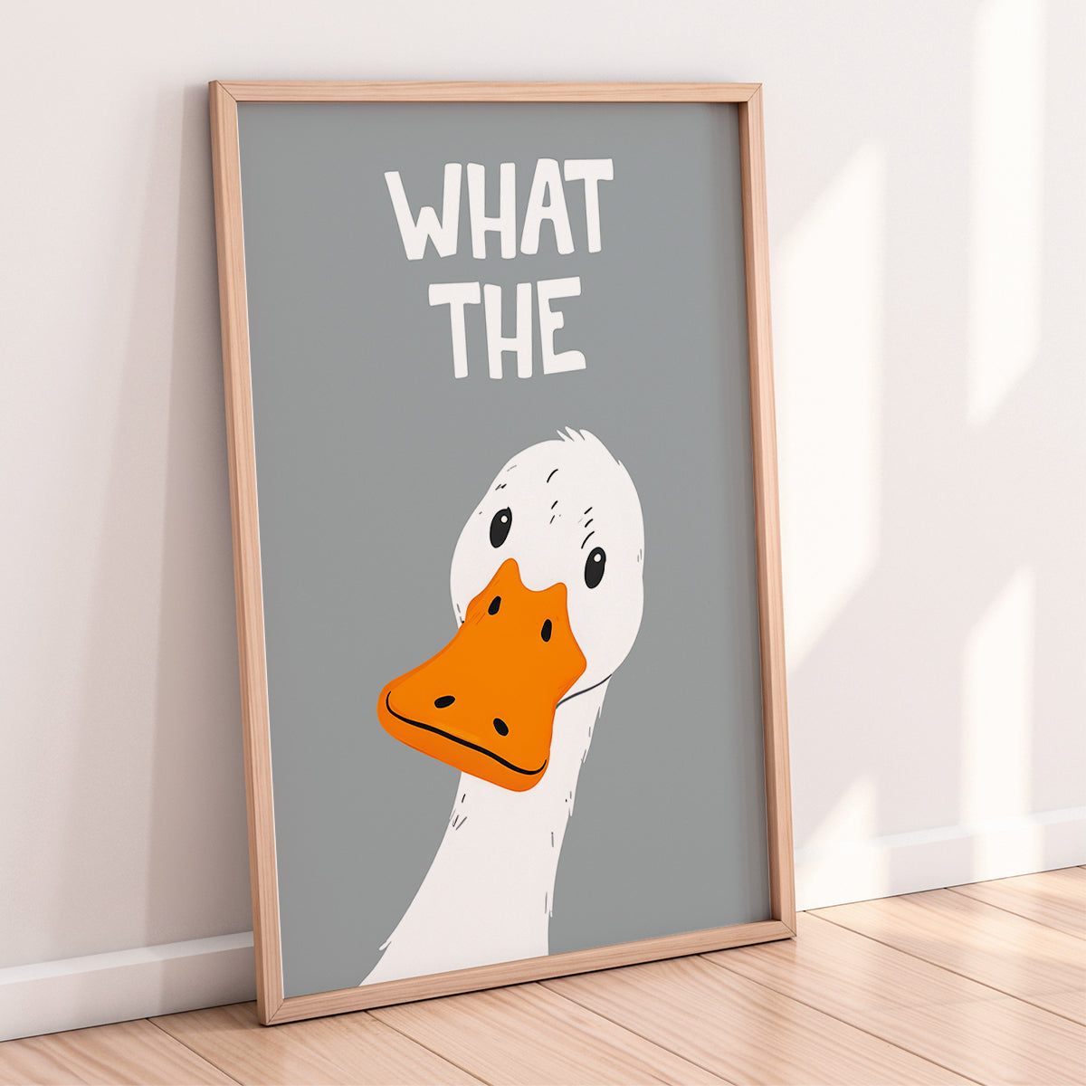 This funny What the Duck wall art print is a playful and bold piece designed to add humour and personality to modern homes.