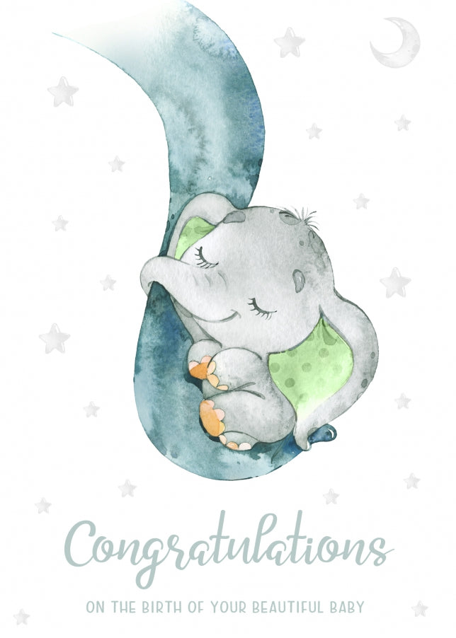 A cute watercolour style new baby card of congratulations. Perfect for proud parents or grandparents when they welcome a newborn son, daughter, grandson or granddaughter in to their family. Designed with a beautiful baby elephant with green ears in her mum's trunk.
