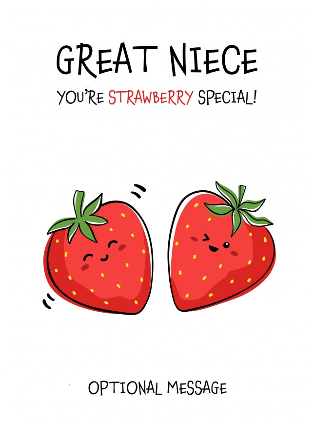 This cute Birthday card for Great Niece has been designed with a pair of cute strawberries on the front and the following wording: