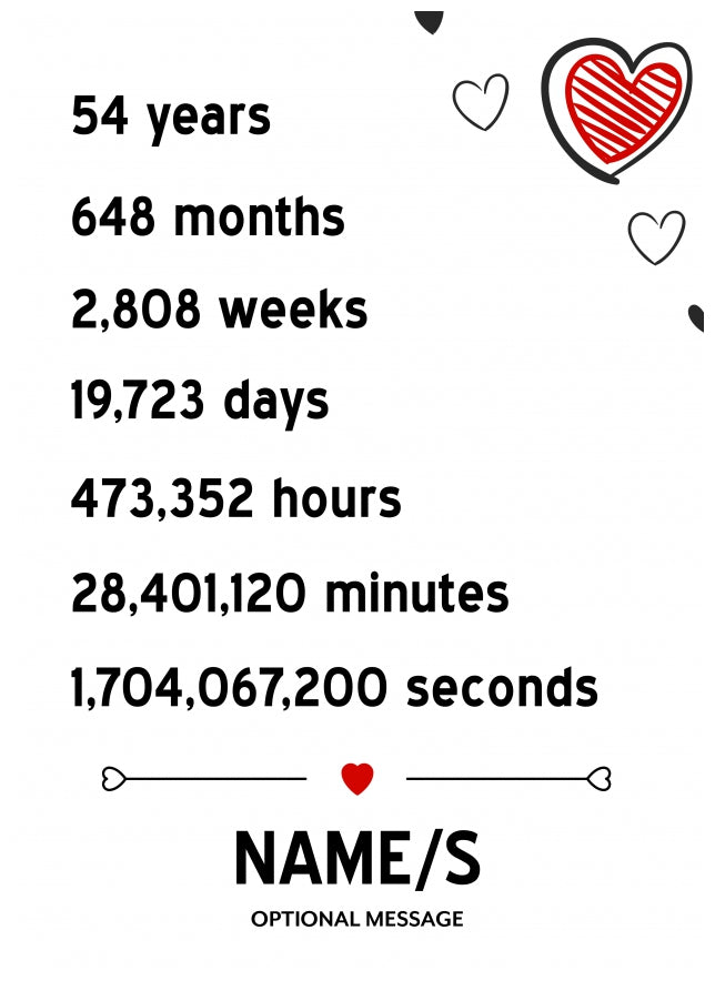 This 54th anniversary Card has been designed with black and red hearts with the following text.