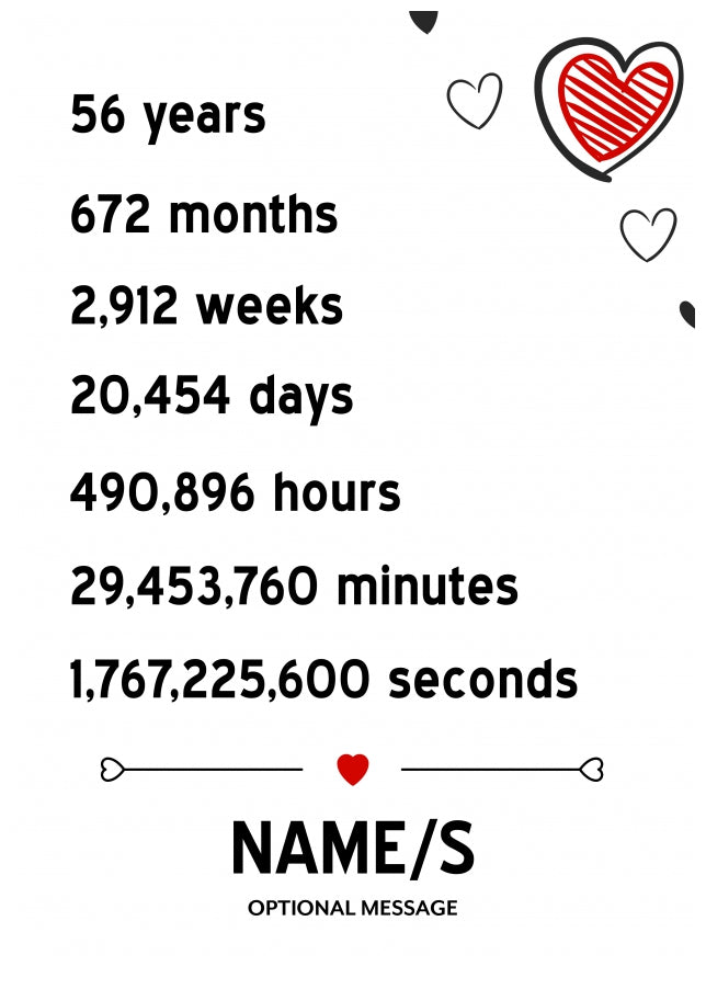 This 56th anniversary Card has been designed with black and red hearts with the following text.