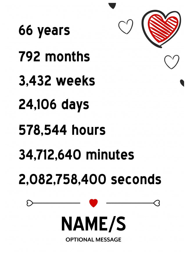 This 66th anniversary Card has been designed with black and red hearts with the following text.