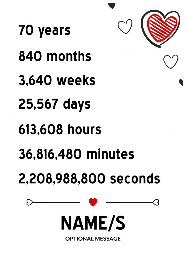 This 70th anniversary Card has been designed with black and red hearts with the following text.