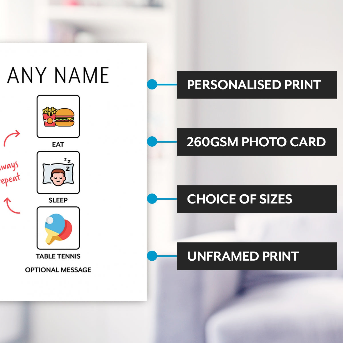 This fun table tennis poster will look amazing hung in a boys bedroom, girls room or as a boys bedroom accessory. This can be given as a gift to your son / daughter / brother / sister or even to a table tennis player.