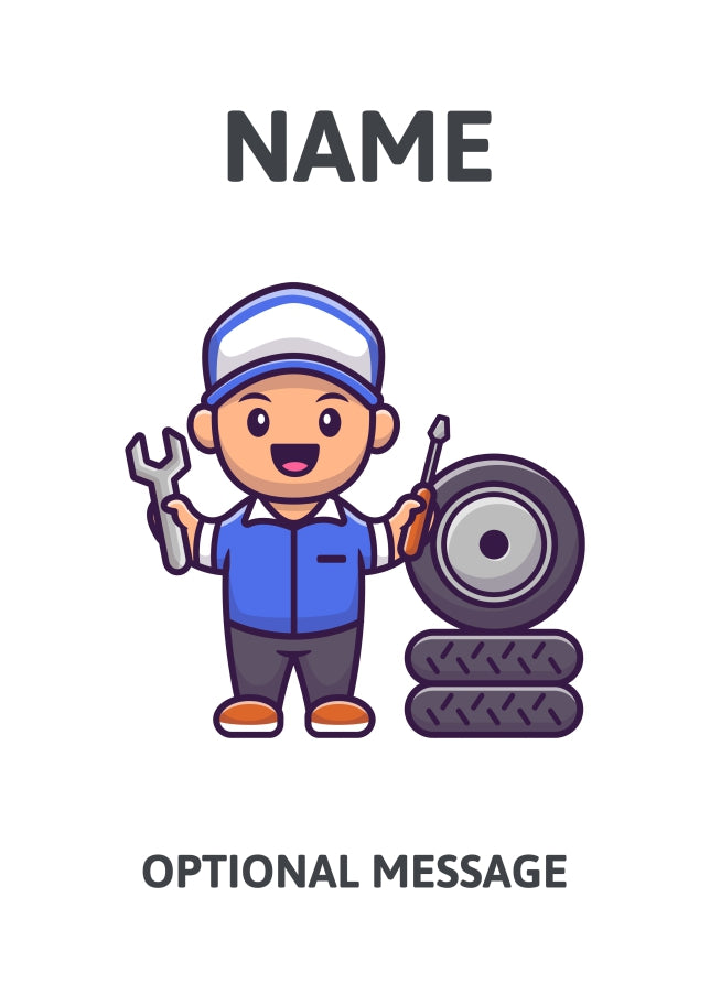 A fun and bold greetings card with Mechanic on the front. It can be used for almost any occasion including kids birthday, father's day, Christmas and more.
