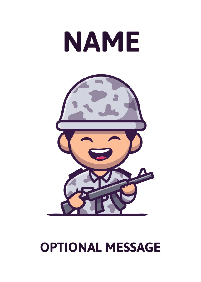 A fun and bold greetings card with Soldier on the front. It can be used for almost any occasion including kids birthday, father's day, Christmas and more.