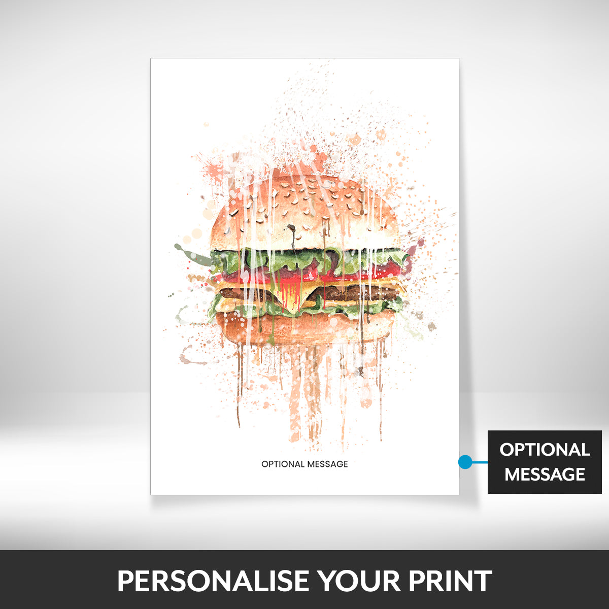 The design features a juicy cheeseburger illustrated in a loose watercolour splatter style, giving it a modern, artistic feel that stands out on any wall.