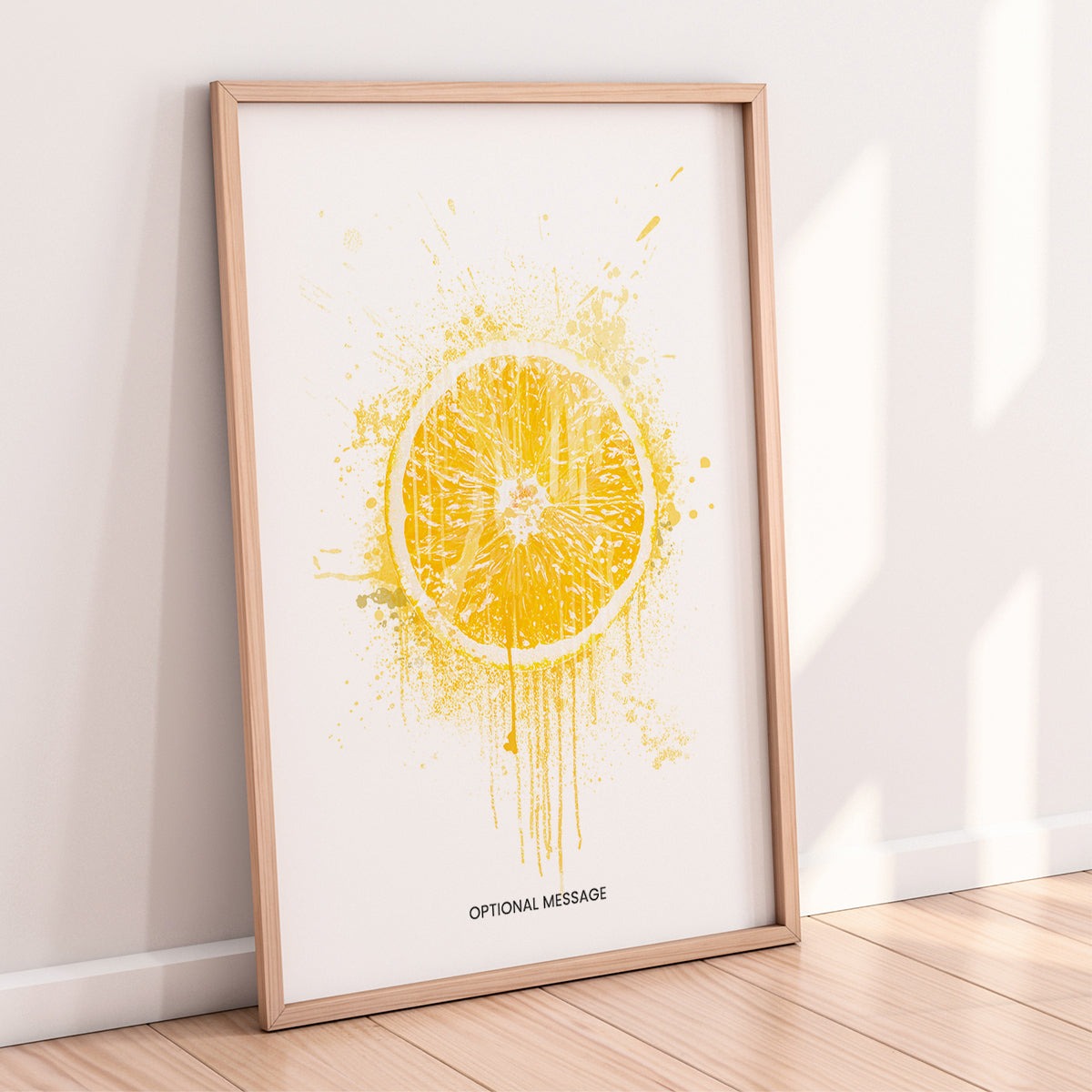 Add a burst of fresh colour to your kitchen with this orange fruit wall art, featuring a bold watercolour splatter illustration.