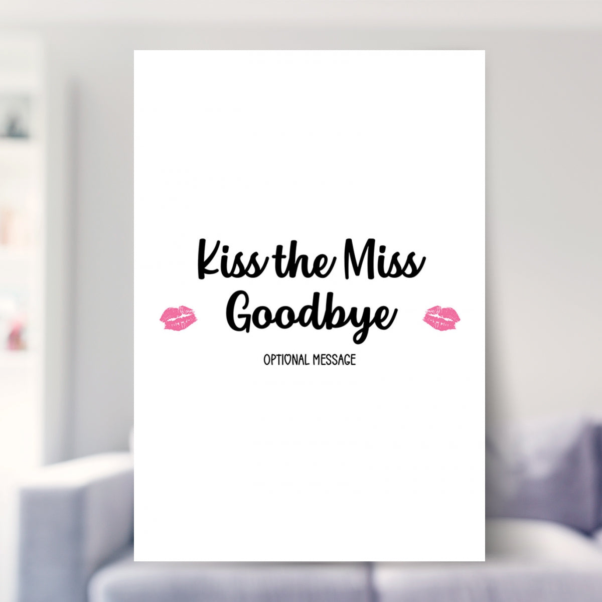 The print has the words "Kiss the Miss Goodbye" (with small printed kisses either side) followed by a message of your choice which can include name, hen party date, location etc.