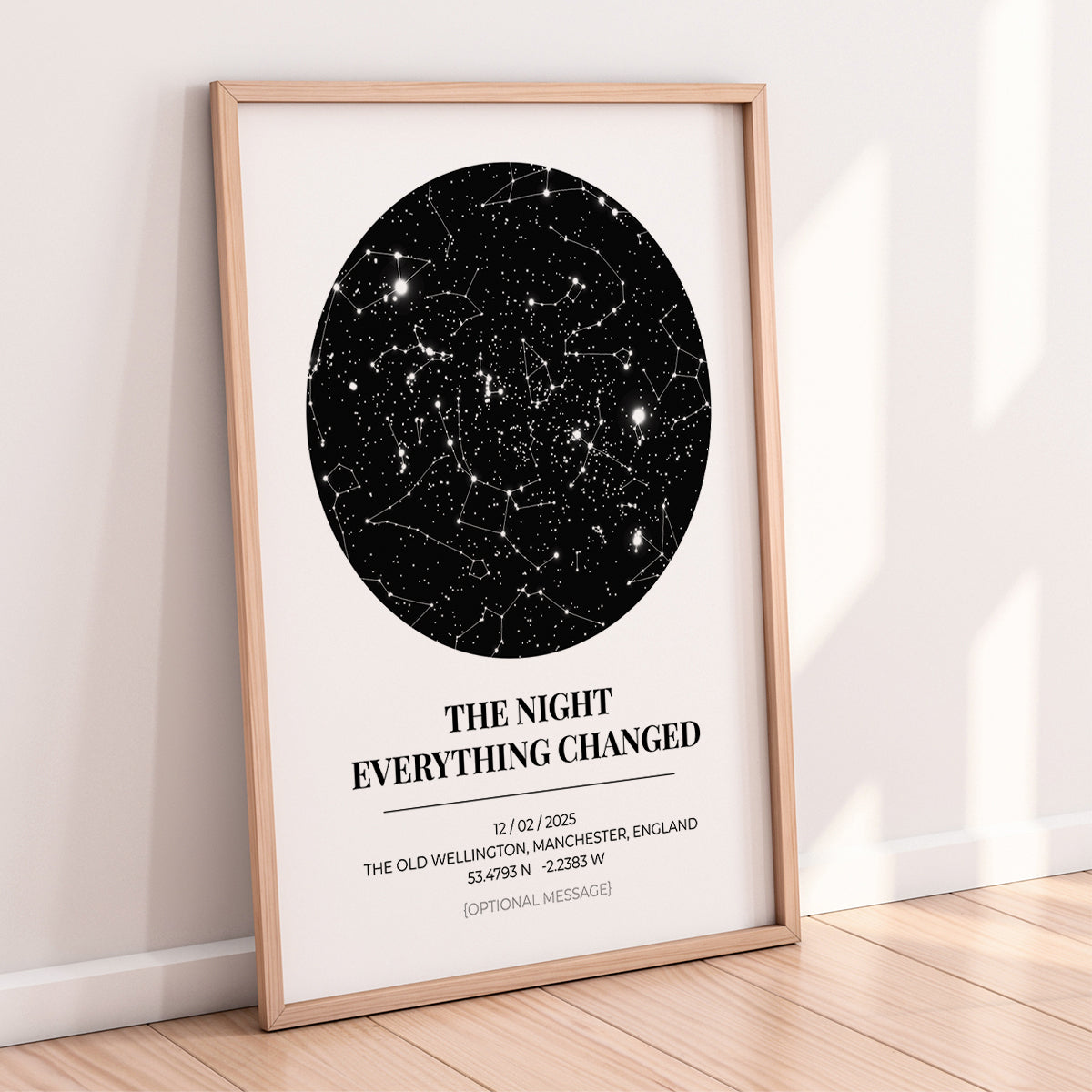 A personalised round star map print designed to capture a moment that changed everything, displayed as the night sky above a meaningful place and date.