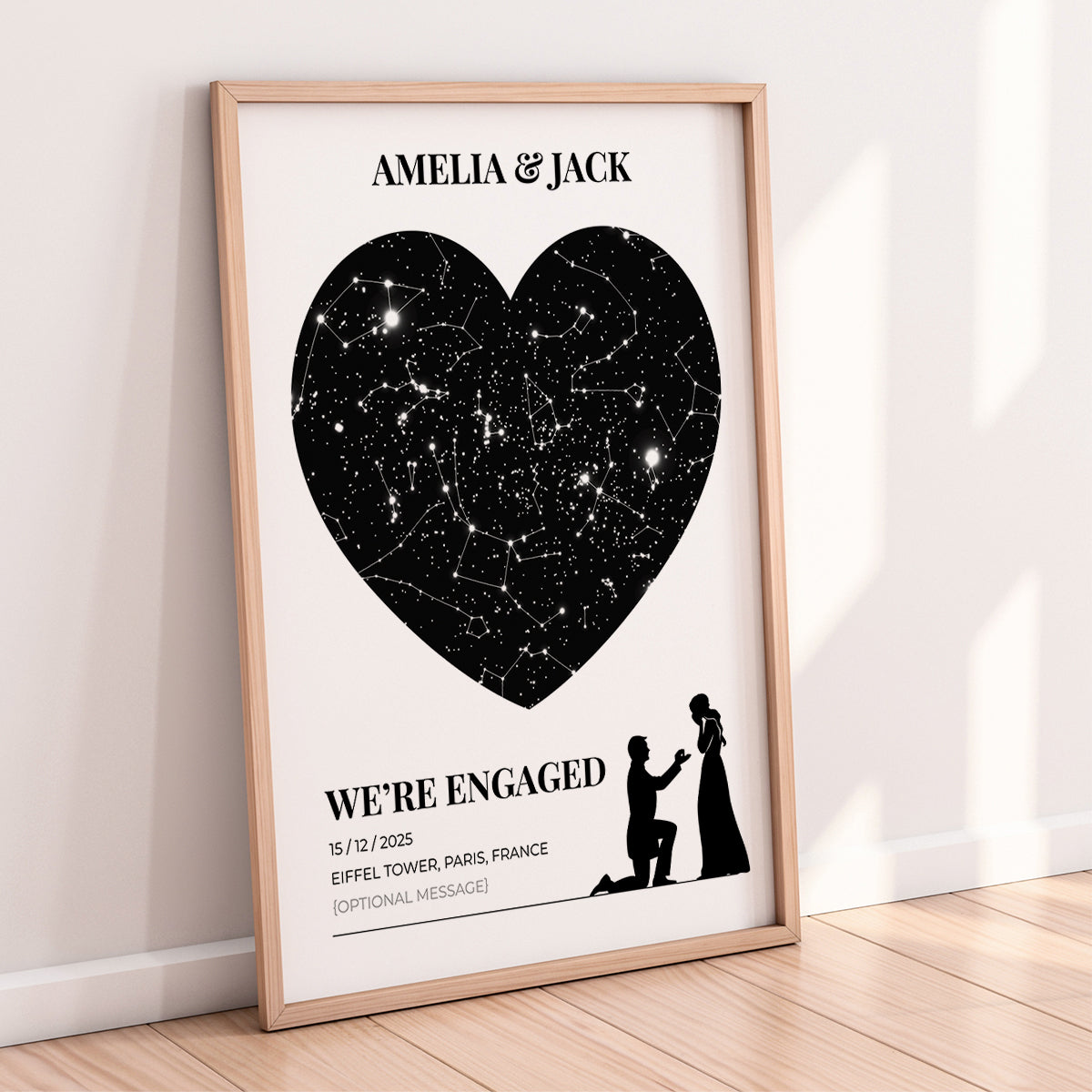 This romantic design features a heart-shaped star map showing the constellations exactly as they appeared on a chosen date and location, paired with names, engagement date and optional message.