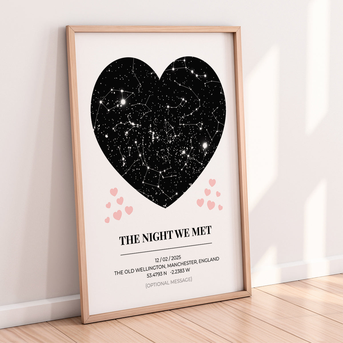 A personalised heart shaped star map print designed to capture a meaningful moment under the night sky.