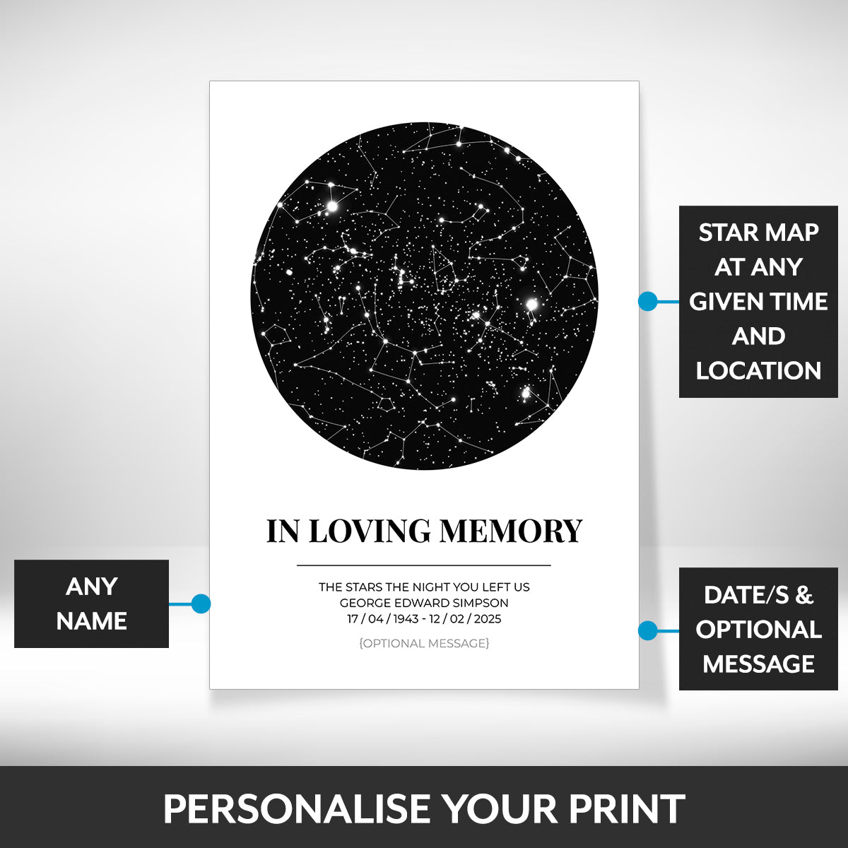 Personalise the print with a name, important dates and an optional message to create a meaningful tribute that celebrates a life and preserves a special moment in the stars.