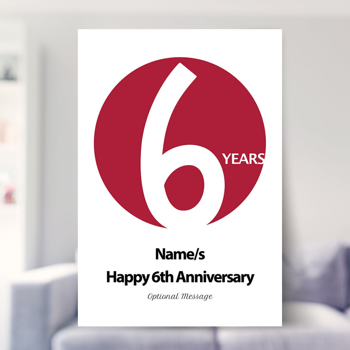 This unique wedding anniversary print is from our Circle design range. A very eye catching design which shows the number of years married along with the couples names, short message at the bottom and "Happy 6th Anniversary".