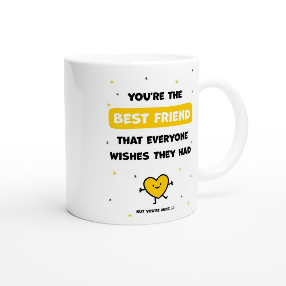This beautiful ceramic mug for best friend is perfect for any event of the day. Your morning coffee, a hot chocolate, or any other hot beverage you enjoy. The mug is glossy white and the prints come out beautifully and vividly on it. The print retains its quality and luster when used in both microwaves and the dishwasher.