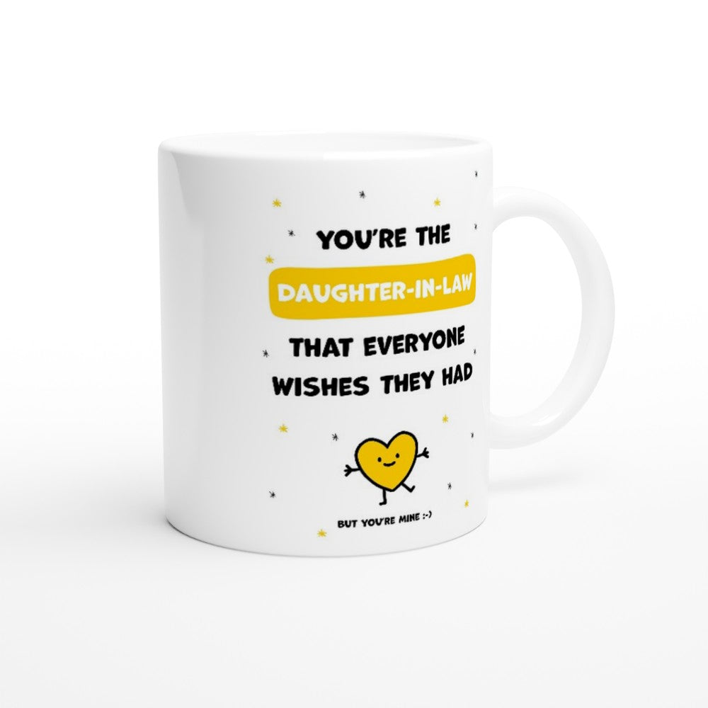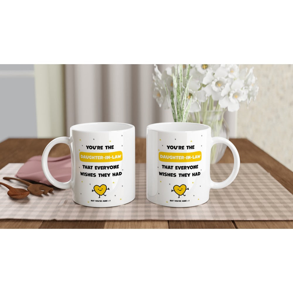 This beautiful ceramic mug for daughter-in-law is perfect for any event of the day. Your morning coffee, a hot chocolate, or any other hot beverage you enjoy. The mug is glossy white and the prints come out beautifully and vividly on it. The print retains its quality and luster when used in both microwaves and the dishwasher.