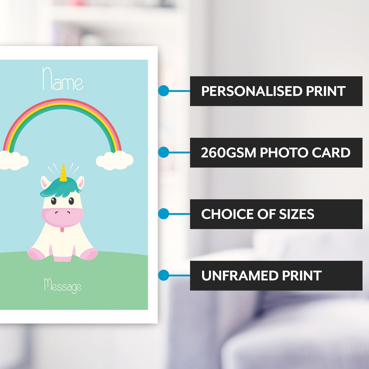 Order your personalised unicorn print today. Produced in full colour, with branded inks and on luxury photo paper for a high quality finish.
