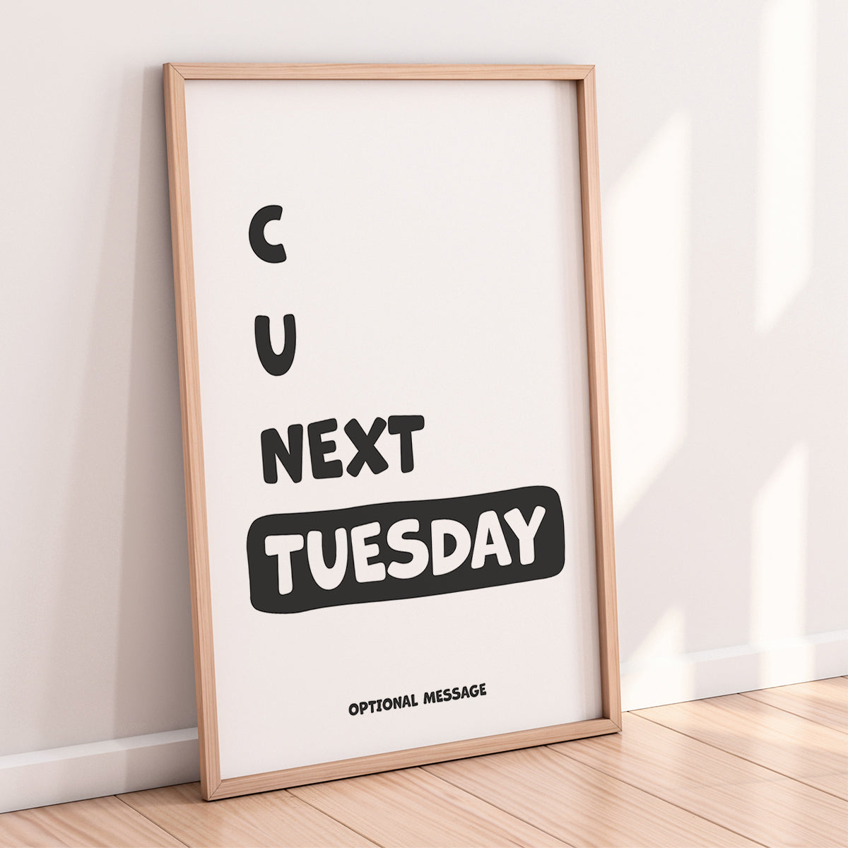 A bold and cheeky typographic print spelling out the classic phrase See you next Tuesday.