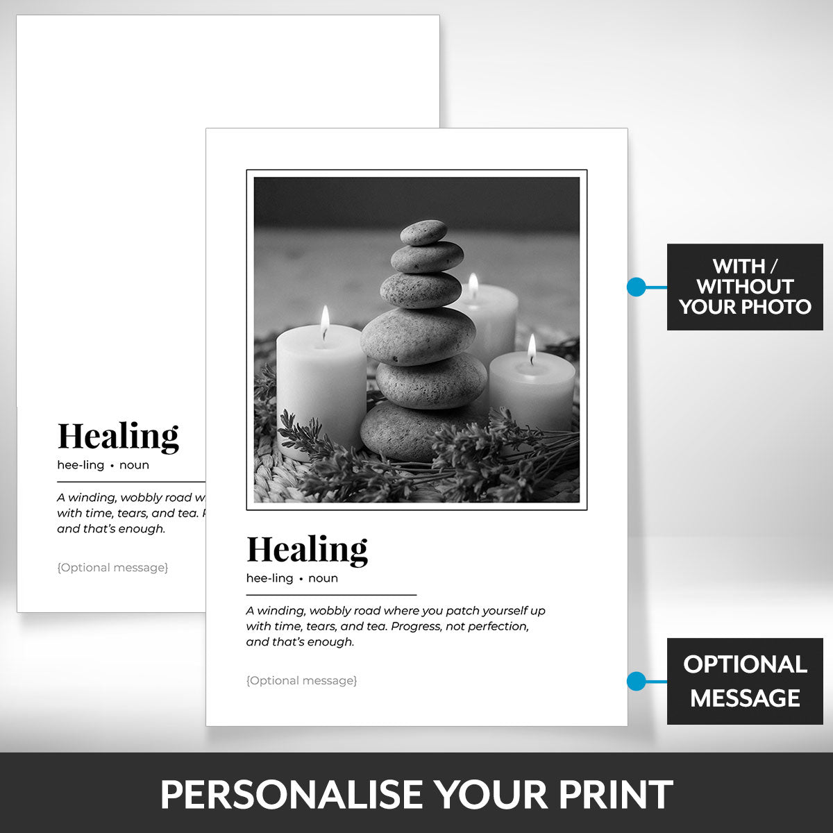A calm, dictionary-style motivational wall art print centred around healing, designed to offer reassurance, patience, and quiet encouragement.