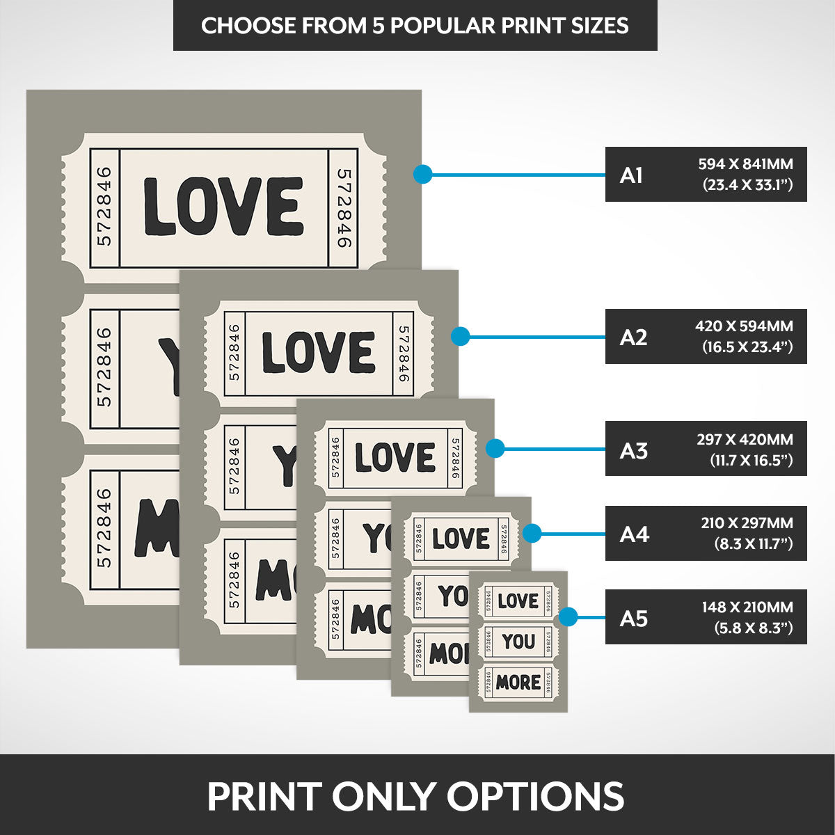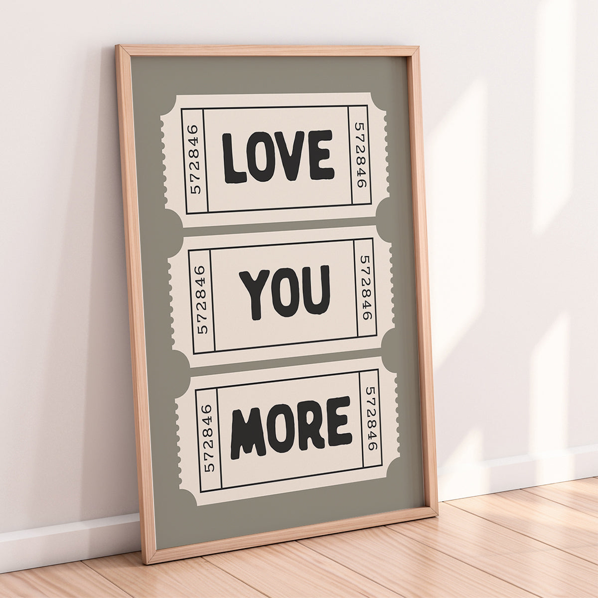A charming retro inspired ticket stub print featuring the phrase “Love You More.” This sweet and nostalgic design adds warmth, sentiment and personality to bedrooms, hallways, living rooms and family spaces.