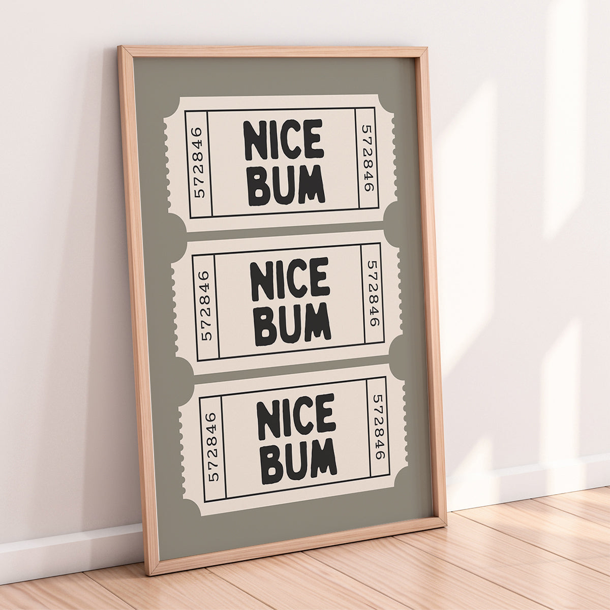 A cheeky and playful retro ticket stub print featuring the bold phrase “Nice Bum”. Designed with hand drawn lettering and a classic vintage ticket layout, this fun print is perfect for bathrooms, bedrooms or anywhere that could use a light hearted compliment.