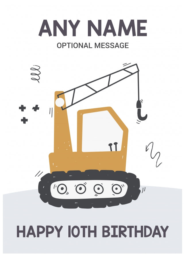 This fun 10th birthday card for Any Name shows yellow crane and has the following text.