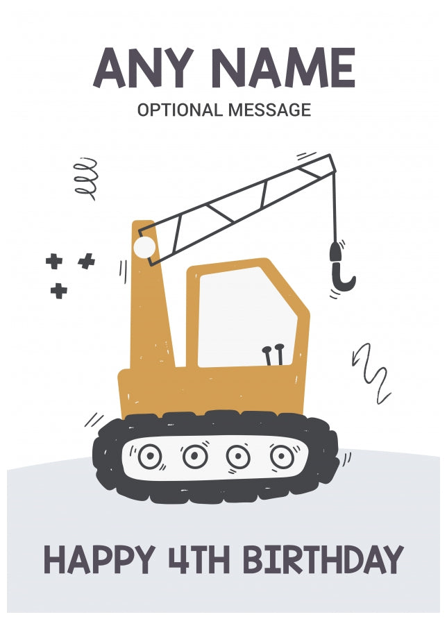 This fun 4th birthday card for Any Name shows yellow crane and has the following text.